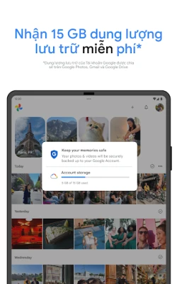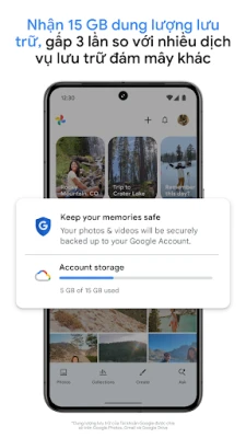 Google Photos là không gian diệu kỳ nơi mọi khoảnh khắc quý giá của bạn được lưu giữ an toàn và dễ dàng truy cập. Mỗi tài khoản Google khởi điểm với 15 GB bộ nhớ miễn phí*, mang đến không gian rộng rãi gấp ba lần so với nhiều dịch vụ khác, đảm bảo bạn có thể tự động sao lưu và bảo tồn kỷ niệm trên mọi thiết bị. Mọi ảnh và video từ các ứng dụng hay thư viện khác giờ đây có thể quy tụ về một nơi duy nhất, tạo nên một kho tàng ký ức đầy đủ và sống động, luôn sẵn sàng chờ bạn khám phá và chia sẻ. Với cơ sở hạ tầng bảo mật tiên tiến của Google, ảnh và video của bạn sẽ luôn được giữ an toàn tuyệt đối.