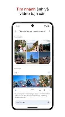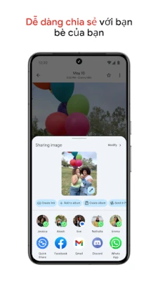 Việc tìm kiếm một bức ảnh trong Google Photos cũng dễ như trò chuyện – chỉ cần mô tả điều bạn muốn, ví dụ như "An và tôi cùng cười" hay "chèo thuyền kayak trên hồ", ứng dụng sẽ đưa bạn đến đúng khoảnh khắc đó. Sống lại những kỷ niệm đẹp đẽ ngay trong ứng dụng và dễ dàng chia sẻ ảnh, video, album với bất kỳ ai, ngay cả khi họ không sử dụng Google Photos. Cần thêm không gian cho thiết bị? Google Photos cho phép bạn giải phóng bộ nhớ điện thoại chỉ với một lần nhấn, sau khi đã sao lưu an toàn mọi thứ trên đám mây. Khám phá thế giới xung quanh qua Google Ống kính, giúp bạn xác định văn bản và đối tượng trong ảnh để tìm hiểu thêm. Và để biến những khoảnh khắc yêu thích thành hiện thực, bạn có thể in ảnh, sách ảnh hoặc các sản phẩm khác ngay từ Google Photos, đưa kỷ niệm từ màn hình vào tổ ấm.